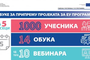 Hiljadu polaznika prošlo obuku za pisanje projekata 21/08/2020 Vesti Za pet meseci organizovali smo 14 radionica na kojima je obuke za pisanje projekata pohađalo hiljadu polaznika. Uslovljeni situacijom izazvanom pandemijom virusa COVID 19, nakon radionica održanih u...